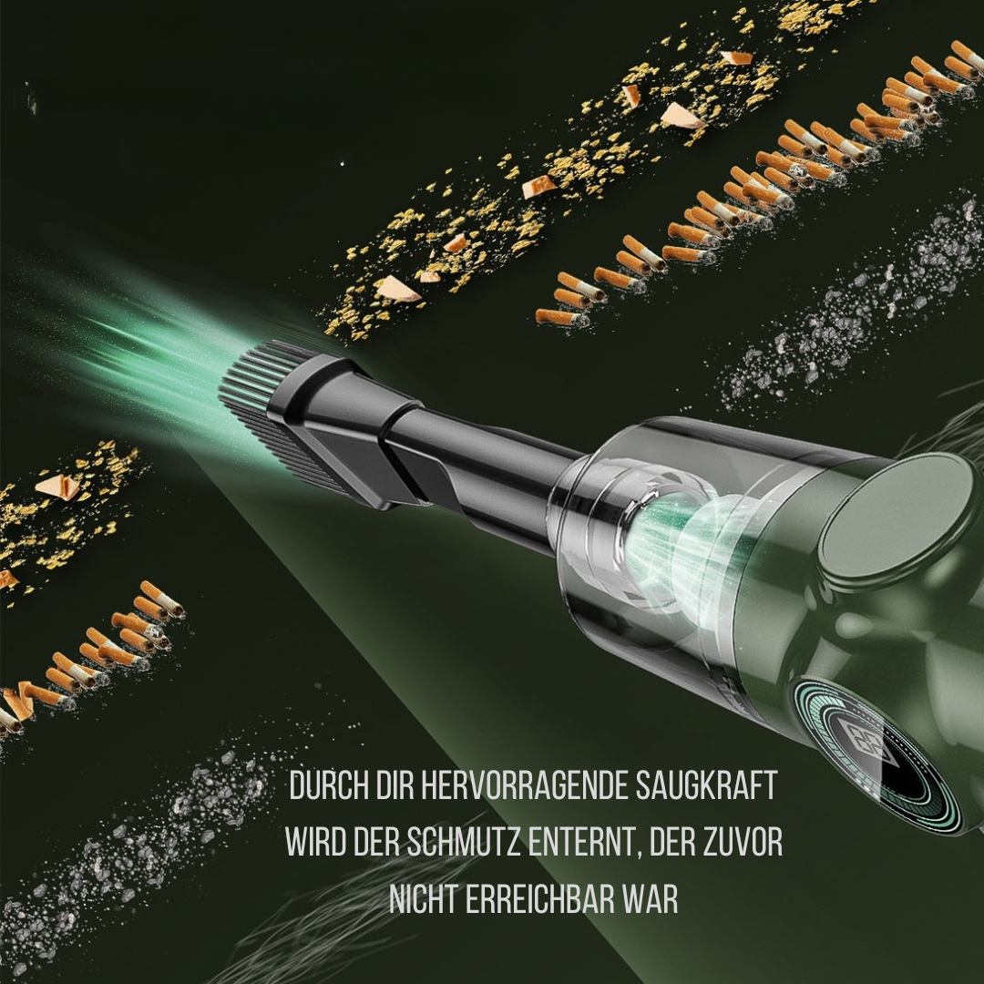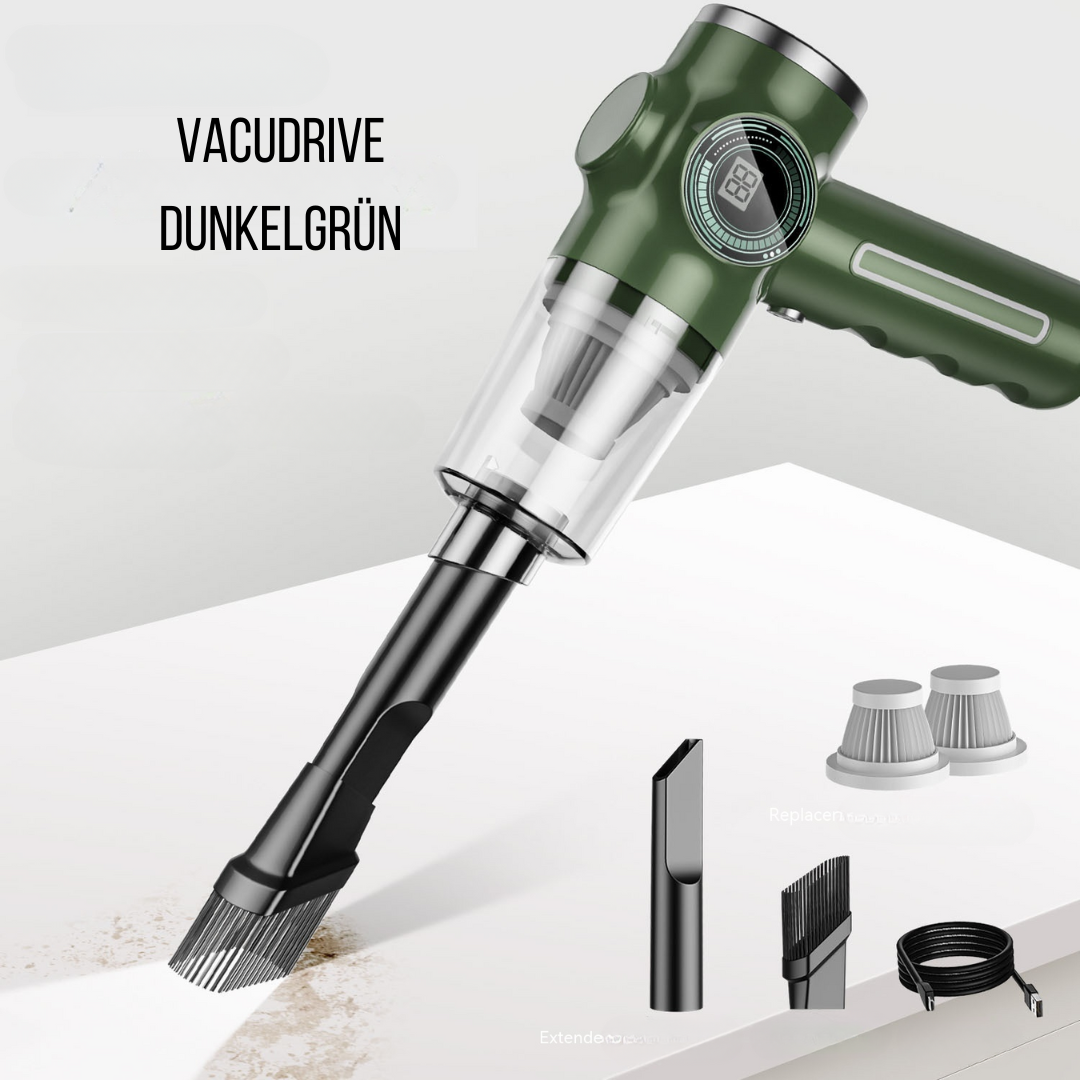 Mit dem leistungsstarken, drahtlosen VacuDrive säuberst Du dein Auto in wenigen Minuten, ohne lästiges Kabelwirrwarr. Der langlebige Akku hält bei voller Laufleistung bis zu 15 Minuten, sodass Du Zeit genug hast, um jeden Winkel deines Fahrzeugs gründlich zu reinigen. Dank seiner kompakten Größe findet dieses Gerät problemlos einen Platz in deinem Auto und ist immer griffbereit. Die einfache Bedienung macht die Nutzung zum Kinderspiel – nur einschalten und loslegen. Verwandel dein Auto im Handumdrehen in eine saubere Wohlfühloase mit dem VacuDrive!